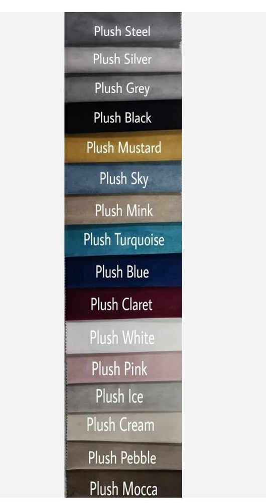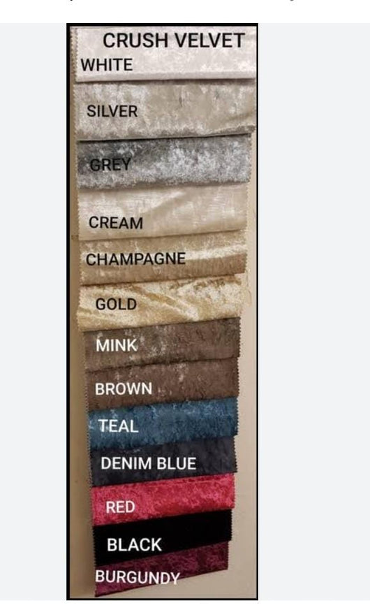 - Fabric options: Crush Velvet, Plush Velvet, and Fabric jumbo Cord